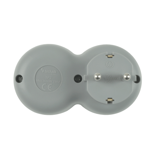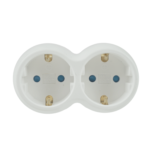 Principais Características 2 tomadas com ligação à terra Capacidade de carga: 16 A Tensão máxima: 250 V AC Design compacto — liga-se diretamente à tomada da parede Caixa interna em PVC com bom isolamento